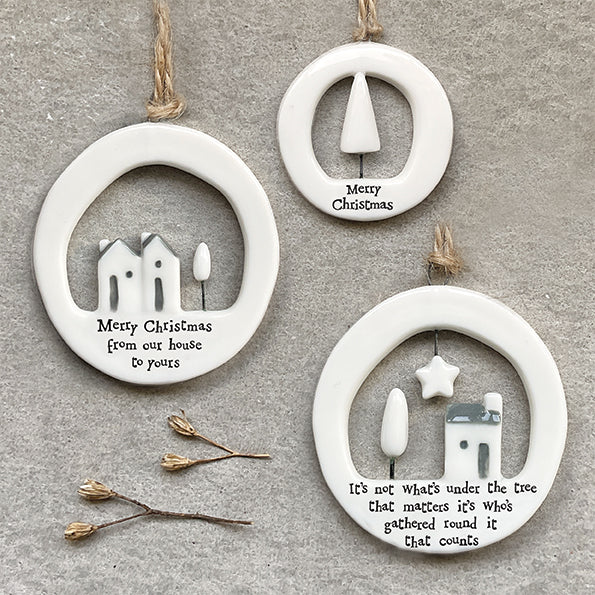 A lovely contemporary white porcelain cut out scene 'Merry Christmas from our house to yours' Hanging Decoration.