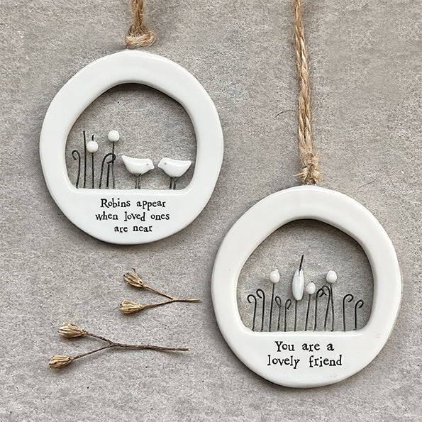 A lovely contemporary white porcelain cut out scene 'Robins appear when loved ones are near' Hanging Decoration