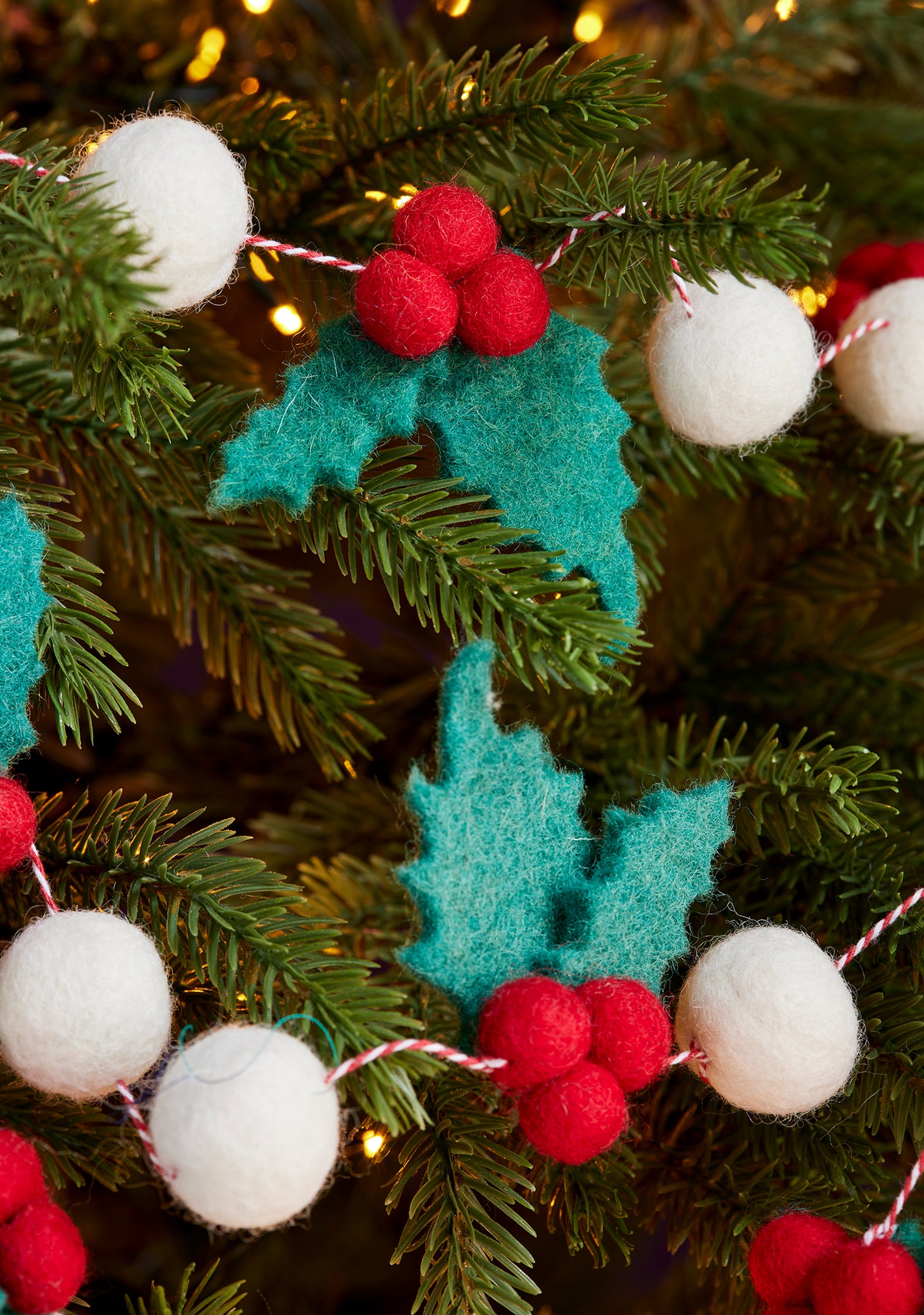 'Get festive with this modern felt holly garland Christmas decoration, created using traditional needle felting methods. Each holly sprig has 3 vibrant red berries - tactile felt pom poms in rows link the sprigs together on a red and white string.