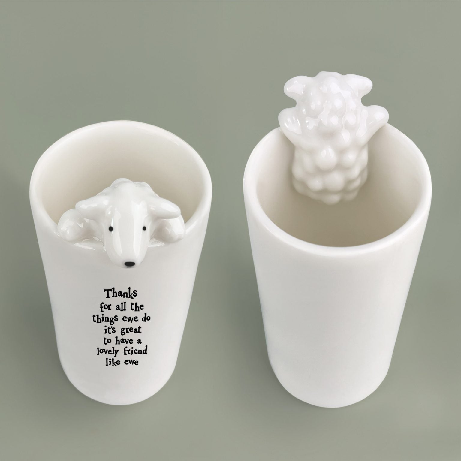 East of India Porcelain Vase with mini sheep and the words 'Thanks for all the things ewe do it's great to have a lovely friend like you.'