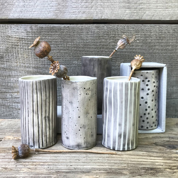 A lovely rustic ceramic look dimpled spot porcelain vase complete in its own gift box.