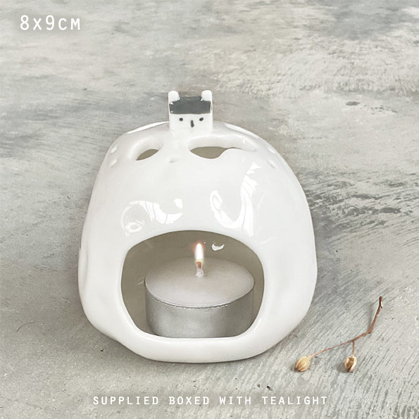 A lovely porcelain tea light holder with inbuilt house decoration.