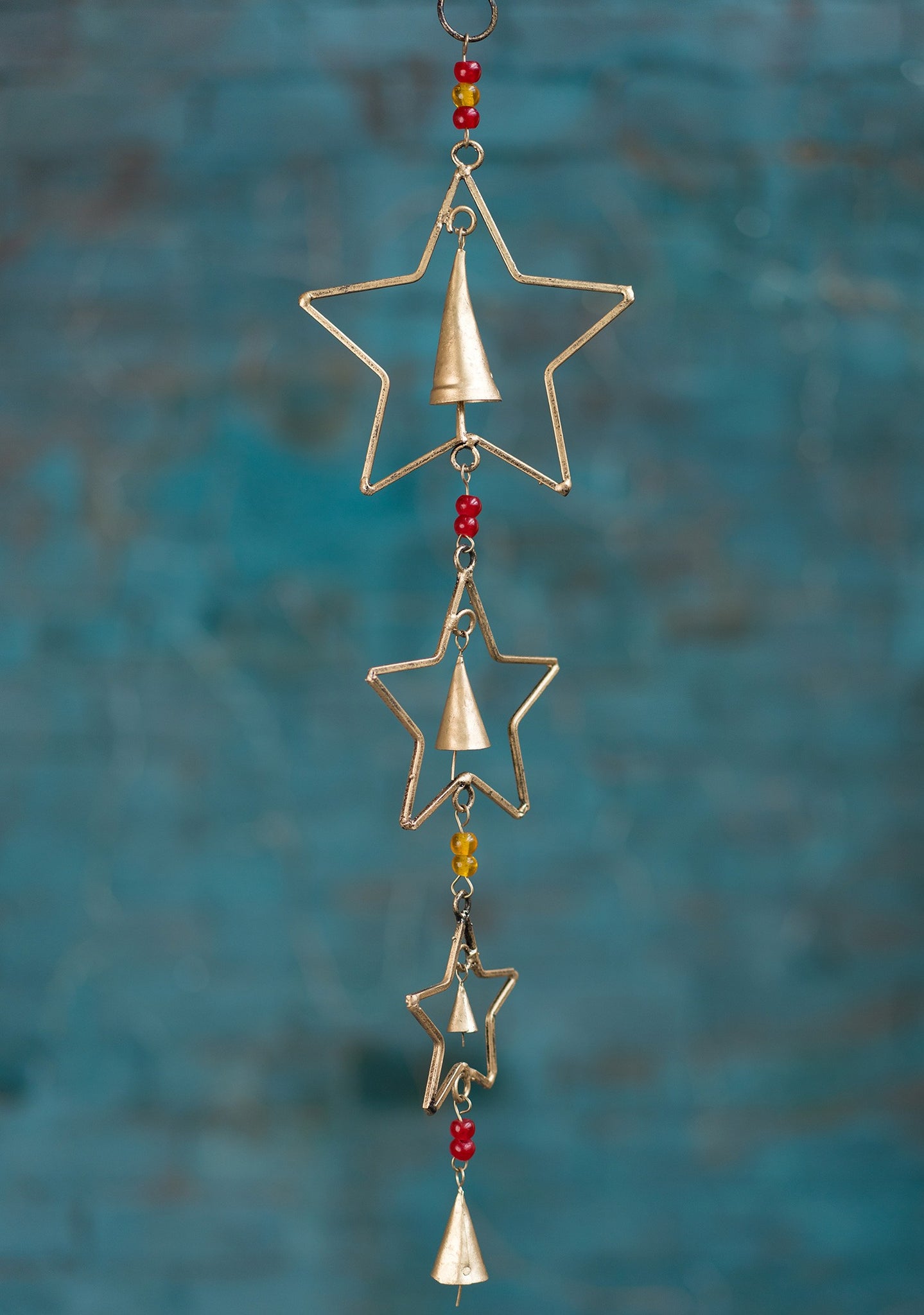 A hanging decorative chain of three 5 point metal stars, reducing in size. Each is joined by coloured glass beads, holds a proportionally sized bell and is finished by a small bell at the end.