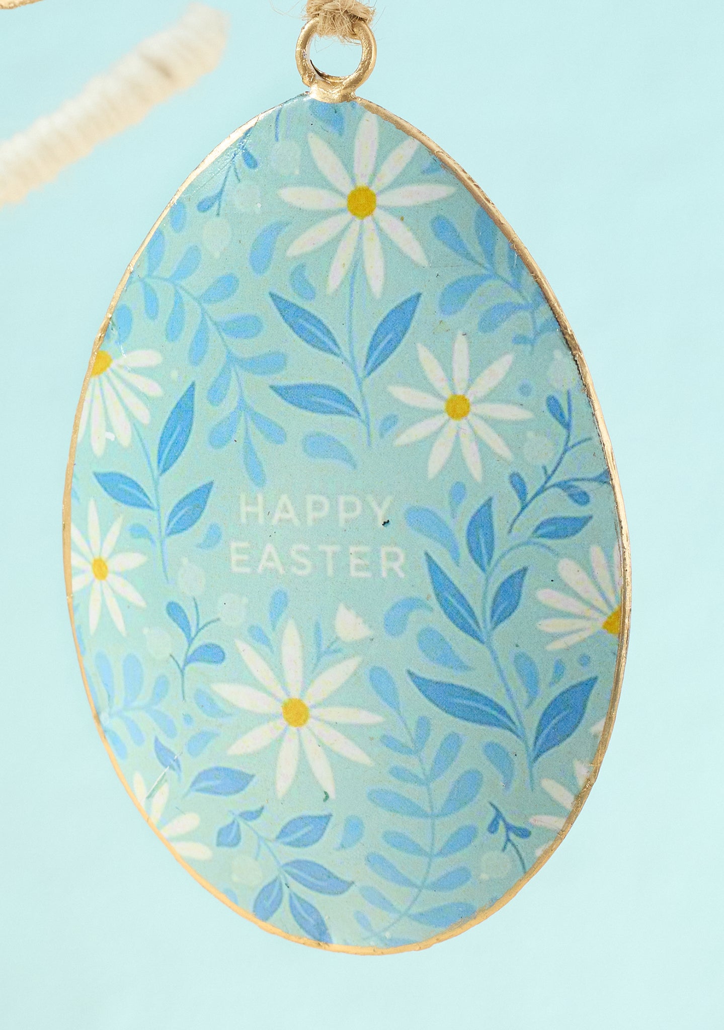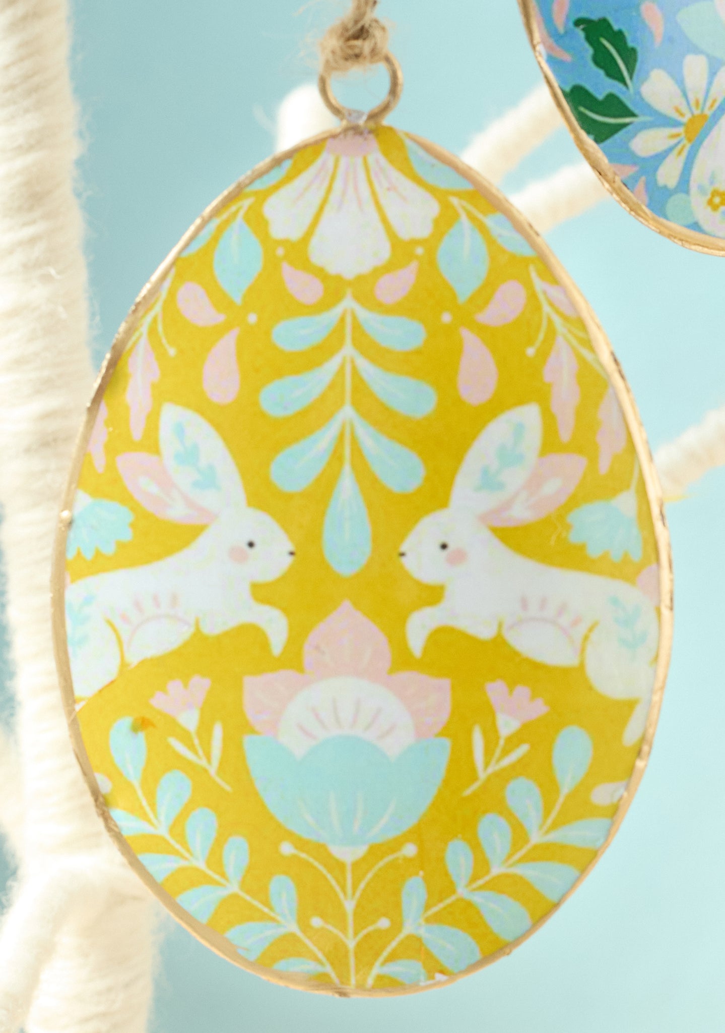 A wonderfully retro Easter egg decoration to display annually with joy. Three cheerful designs of Easter bunnies and happy greetings hang from a natural jute string.