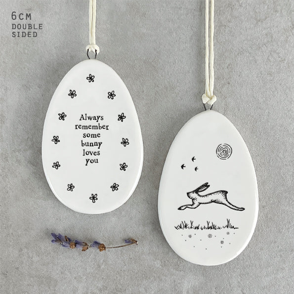 A lovely porcelain egg shape hanging ornament with floral illustration and the words 'Always remember some bunny loves you'