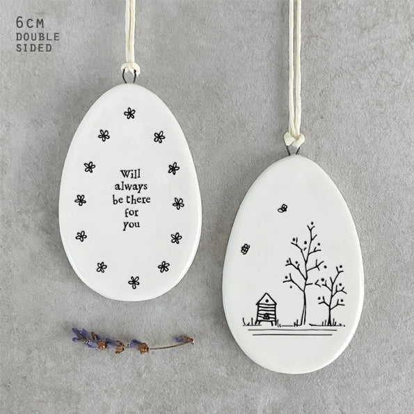 A lovely porcelain egg shape hanging ornament with floral illustration and the words 'Will always be there for you'